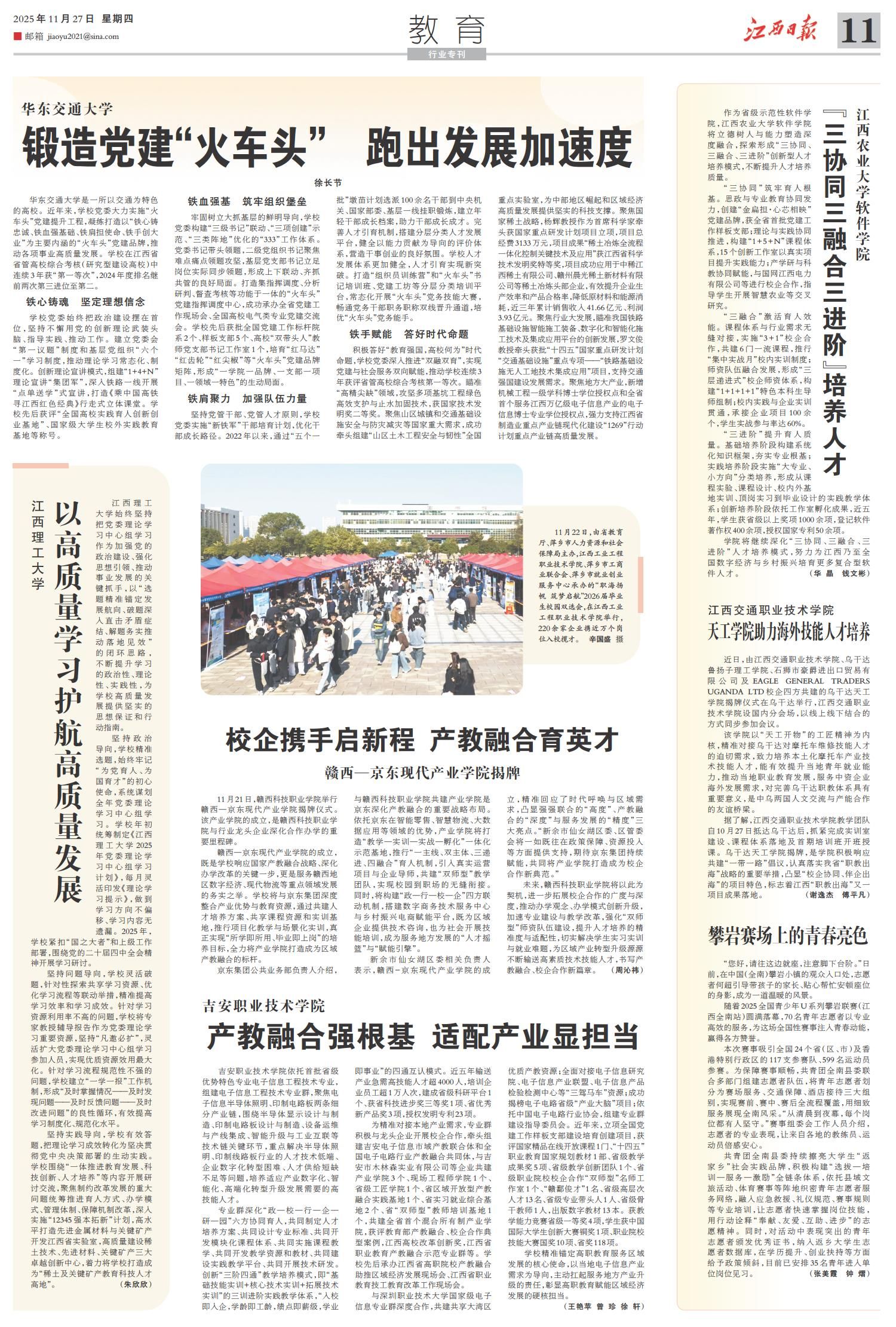 学校党委始终把政治建设摆在首位,坚持不懈用党的创新理论武装头脑、指导实践、推动工作。建立党委会“第一议题”制度和基层党组织“六个一”学习制度,推动理论学习常态化、制度化。创新理论宣讲模式,组建“1+4+N”理论宣讲“集团军”,深入铁路一线开展“点单送学”式宣讲,打造《乘中国高铁 寻江西红色经典》行走式立体课堂。学校先后获评“全国高校实践育人创新创业基地”、国家级大学生校外实践教育基地等称号。