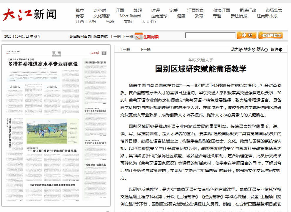 涉外人才培养最终要服务于国家与地方高水平开放。江西正在构建产业就业融合发展新格局,为经济社会高质量发展注入不竭动力,亟需能参与国际合作的复合型人才。beat365中文唯一官网通过国别区域研究赋能葡语人才培养,致力培育一批能讲好中国故事、江西故事,并能精准对接葡语国家发展需求的桥梁式人才。学生不仅语言功底扎实,更能通过学术研究分析对象国国情,在全球发展倡议背景下,为中外在减贫、粮食安全、基建等领域的务实合作贡献智慧。