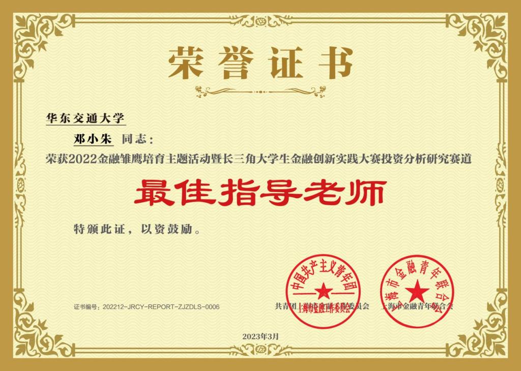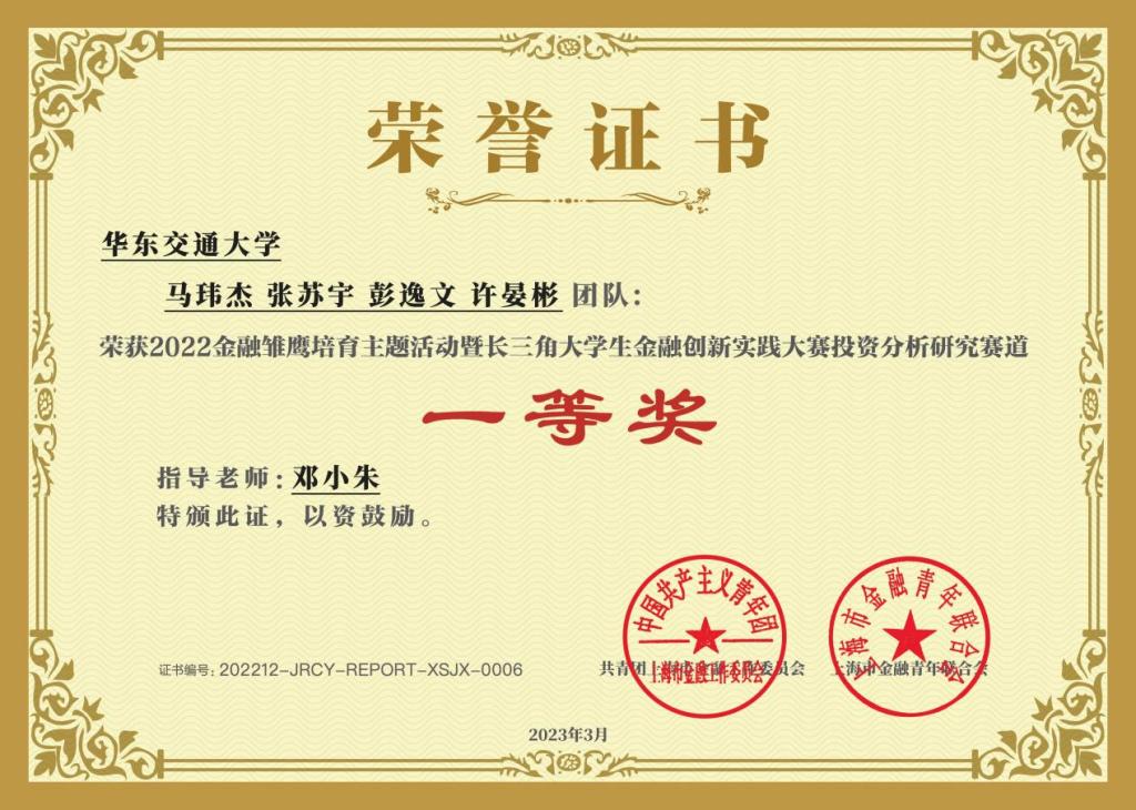 本次比赛自启动报名以来,吸引主流媒体和高校师生热切关注。大赛共吸引包括中国科学院大学、厦门大学、中南大学、中国农业大学、西南财经大学等上千所高校,共计3000多支队伍参与并提交投资研究报告。根据大赛规则和评审结果,在邓小朱教授带领下,我院2022级金融专业硕士组队参赛,马玮杰、张苏宇、彭逸文、许晏彬组队获得“一等奖”;邓小朱获得“最佳指导老师”称号。