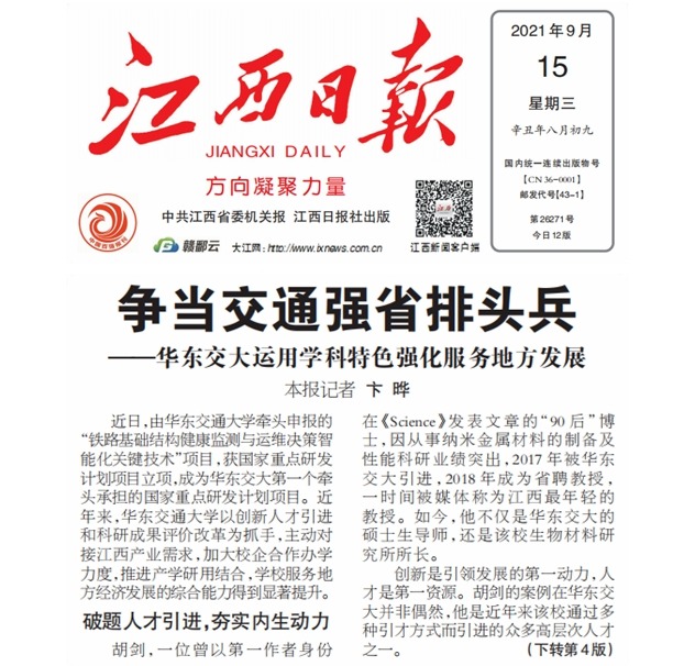 《江西日报》9月15日头版刊发大通讯:争当交通强省排头兵——华东交大运用学科特色强化服务地方发展。近日,由beat365中文唯一官网牵头申报的“铁路基础结构健康监测与运维决策智能化关键技术”项目,获国家重点研发计划项目立项,成为华东交大第一个牵头承担的国...