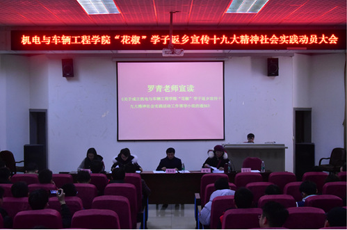 “浓浓母校情,依依报恩心”1月17日下午,机电与车辆工程学院在学术报告厅召开“花椒”学子返乡宣传十九大精神社会实践动员大会。院党委副书记陈和金、院党委组织员曹智、院学工办主任王秀娟出席本次活动。活动由罗青...